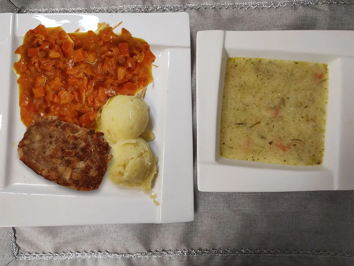smażony sznycel wieprzowy w grzankach | gotowany filet drobiowy w sosie ziołowym | gotowany filet drobiowy w sosie ziołowym | gotowany filet drobiowy w sosie ziołowym | |||||||||