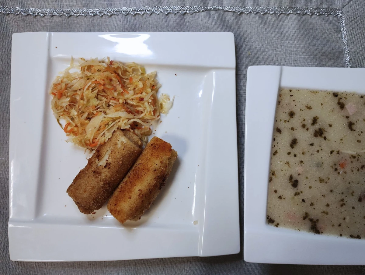 smażone krokiety z mięsem wieprzowym | gotowany biały makaron z mięsem drobiowym i warzywami | gotowany brązowy makaron z mięsem drobiowym i warzywami | gotowany biały makaron z mięsem drobiowym i warzywami | |||||||||