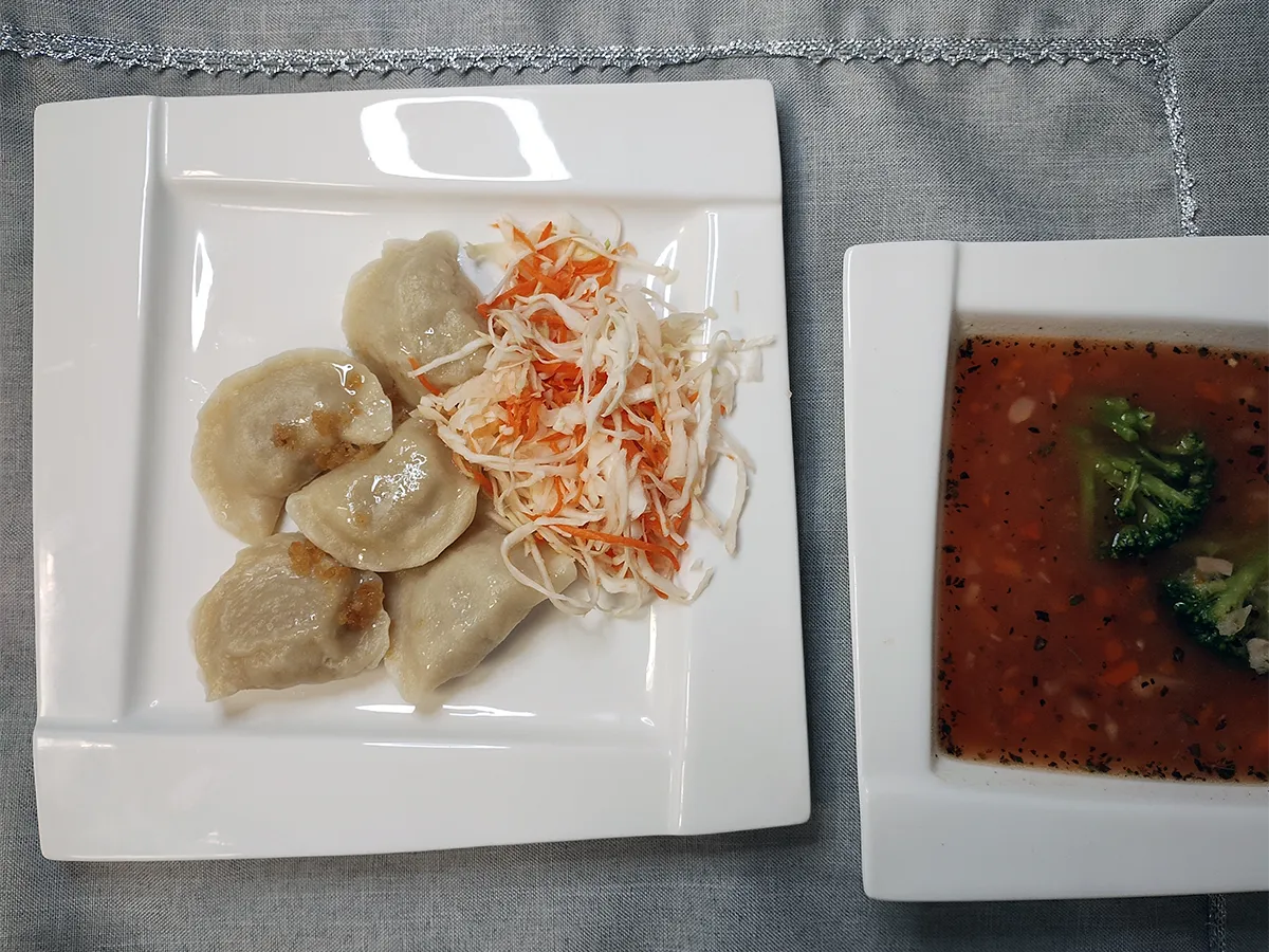 | gotowane pierogi z mięsem | gotowany zraz drobiowy w sosie jarzynowym | gotowany zraz drobiowy w sosie jarzynowym | gotowany zraz drobiowy w sosie jarzynowym | |||||||||