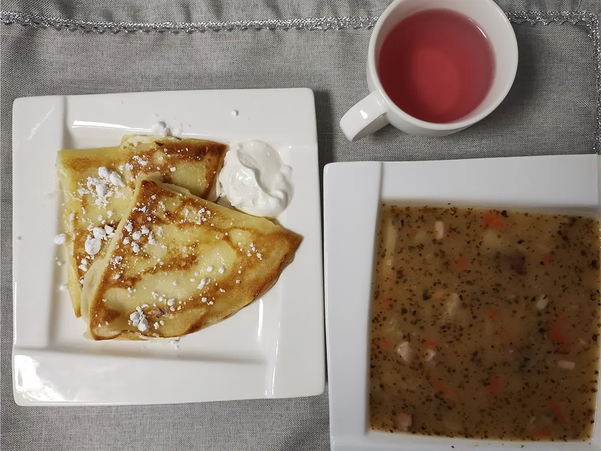 smażone naleśniki z serem twarogowym, śmietaną i cukrem pudrem |