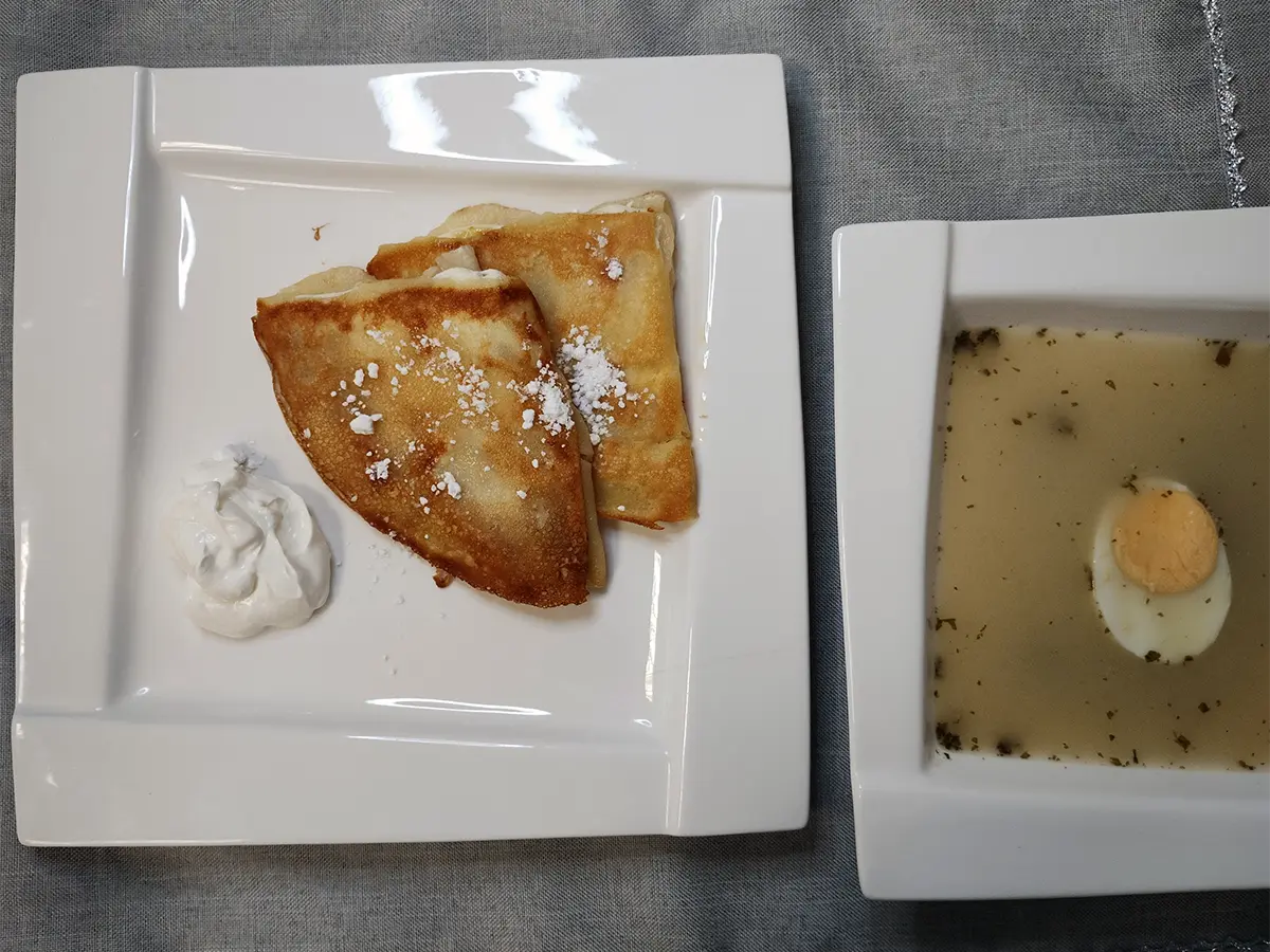 smażone naleśniki z twarogiem, cukrem pudrem i śmietaną |