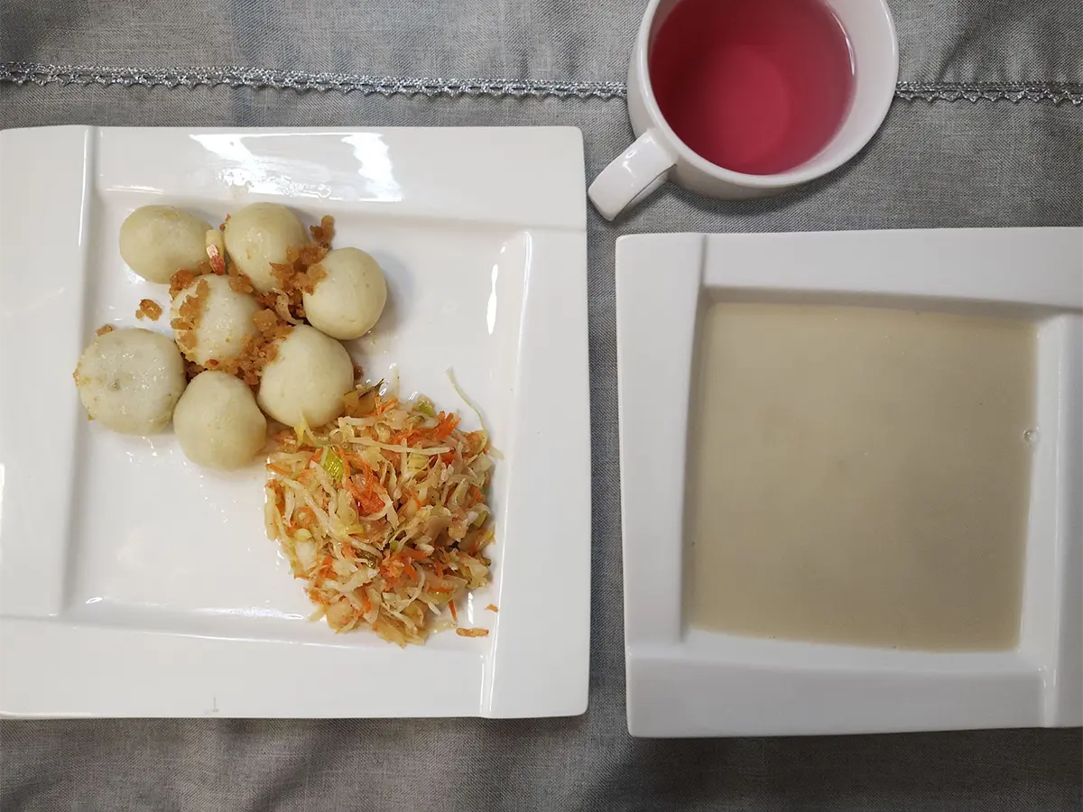 gotowane pyzy z mięsem | gotowany biały makaron z mięsem i warzywami | gotowany brązowy makaron z mięsem i warzywami | gotowany biały makaron z mięsem i warzywami | |||||||||