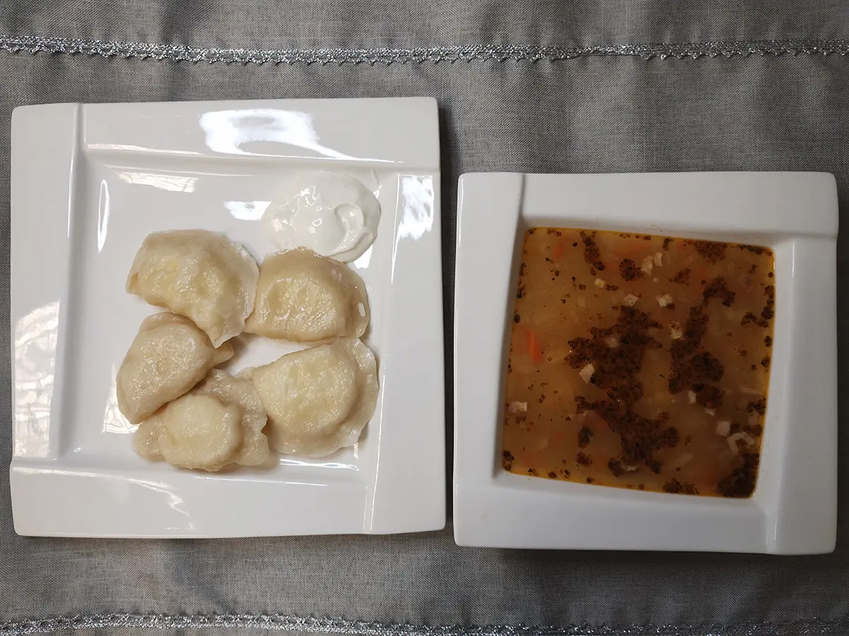 gotowane pierogi ruskie ze śmietaną | gotowany biały makaron z serem twarogowym i masłem | gotowany brązowy makaron z serem twarogowym i masłem | gotowany biały makaron z serem twarogowym i masłem | |||||||||