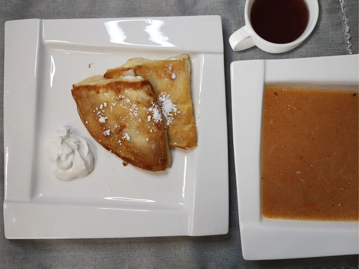 smażone naleśniki z serem twarogowym, śmietaną i cukrem pudrem | gotowane pierogi leniwe z masłem | gotowane pierogi leniwe z masłem | gotowane pierogi leniwe z masłem | |||||||||