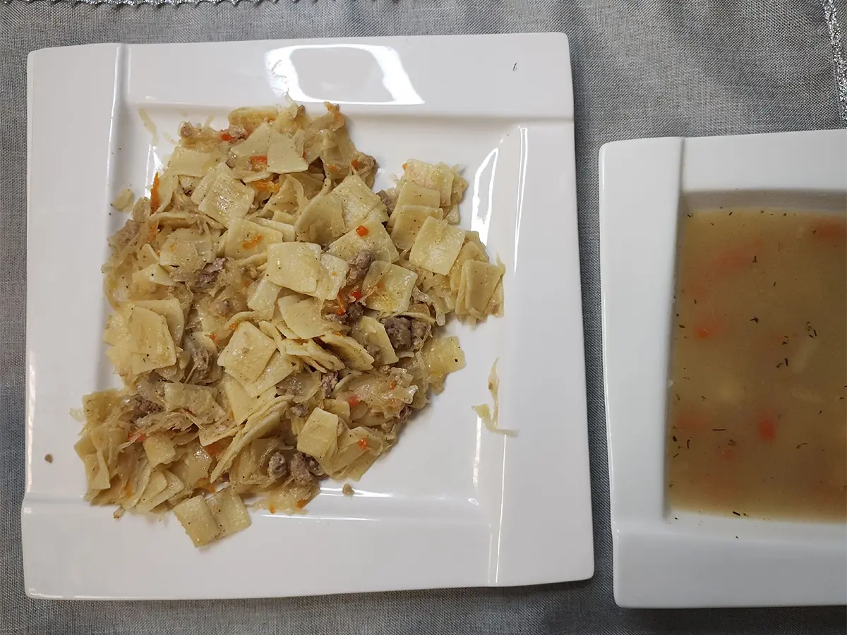 gotowane łazanki z mięsem wieprzowym i kapustą kwaszoną | gotowany zraz drobiowy w sosie jarzynowym | gotowany zraz drobiowy w sosie jarzynowym | gotowany zraz drobiowy w sosie jarzynowym | |||||||||