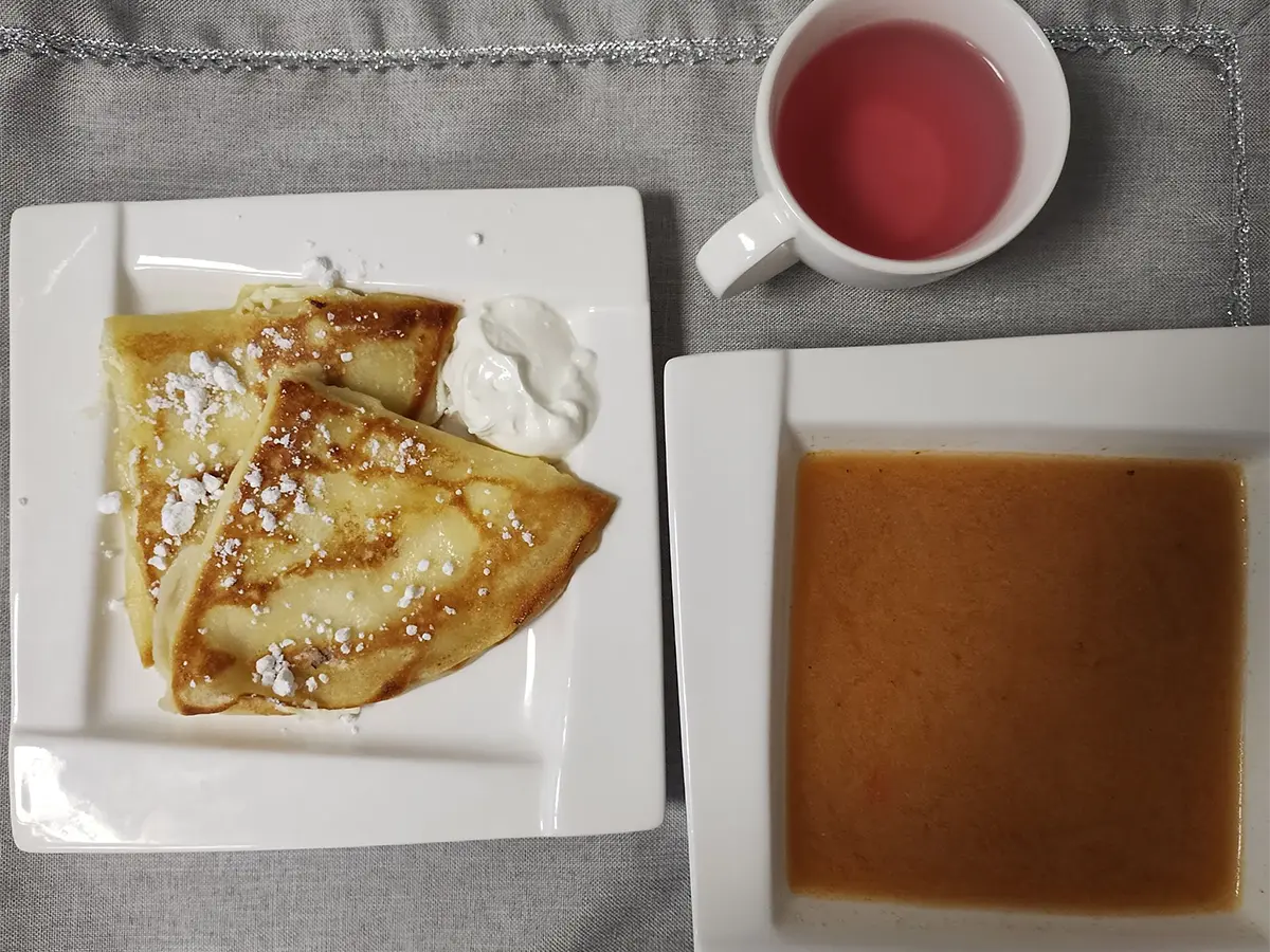 smażone naleśniki z serem twarogowym, śmietaną i cukrem pudrem |