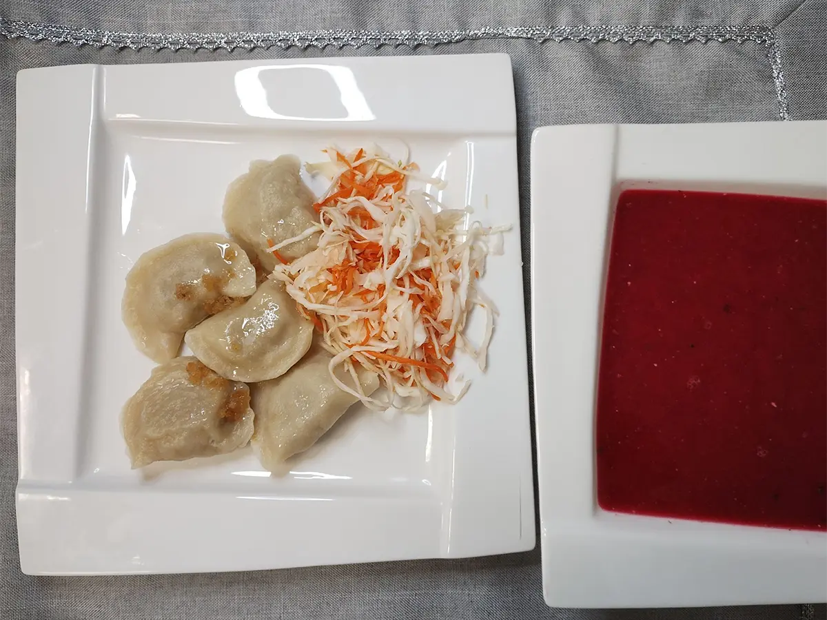 gotowane pierogi z mięsem wieprzowym i kapustą kwaszoną | gotowany zraz drobiowy w sosie jarzynowym | gotowany zraz drobiowy w sosie jarzynowym | gotowany zraz drobiowy w sosie jarzynowym | |||||||||