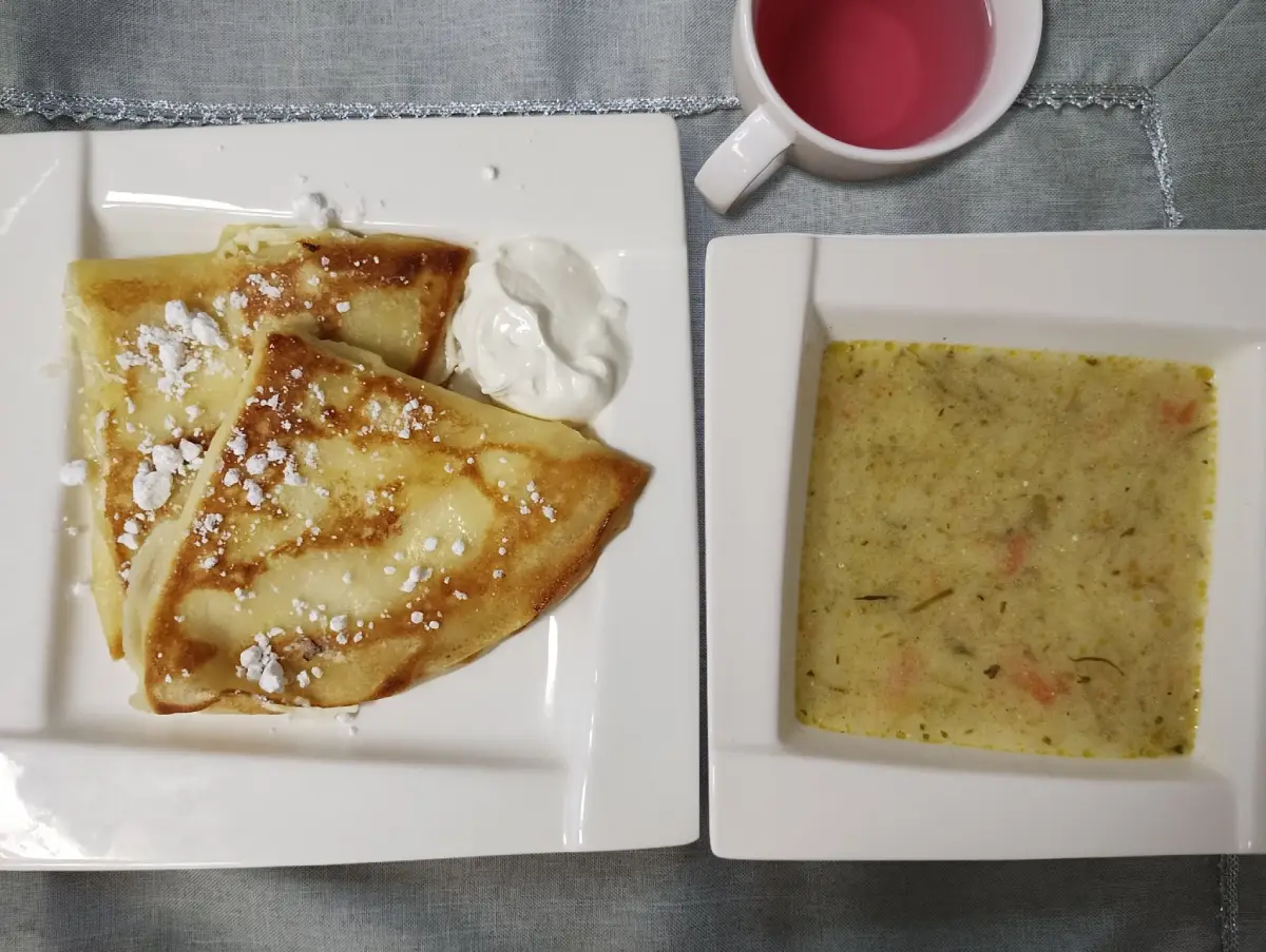 smażone naleśniki z serem twarogowym, śmietaną i cukrem pudrem | gotowany biały ryż z sosem jabłkowym | gotowany brązowy ryż z sosem jabłkowym | gotowany biały ryż z sosem jabłkowym | |||||||||