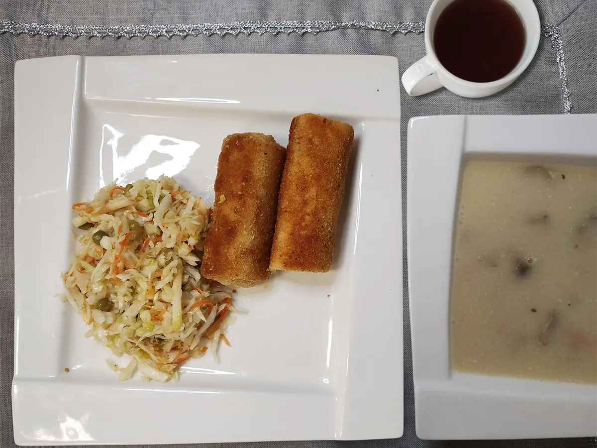 smażone krokiety z mięsem wieprzowym | gotowany biały makaron z mięsem drobiowym i warzywami | gotowany brązowy makaron z mięsem drobiowym i warzywami | gotowany biały makaron z mięsem drobiowym i warzywami | |||||||||