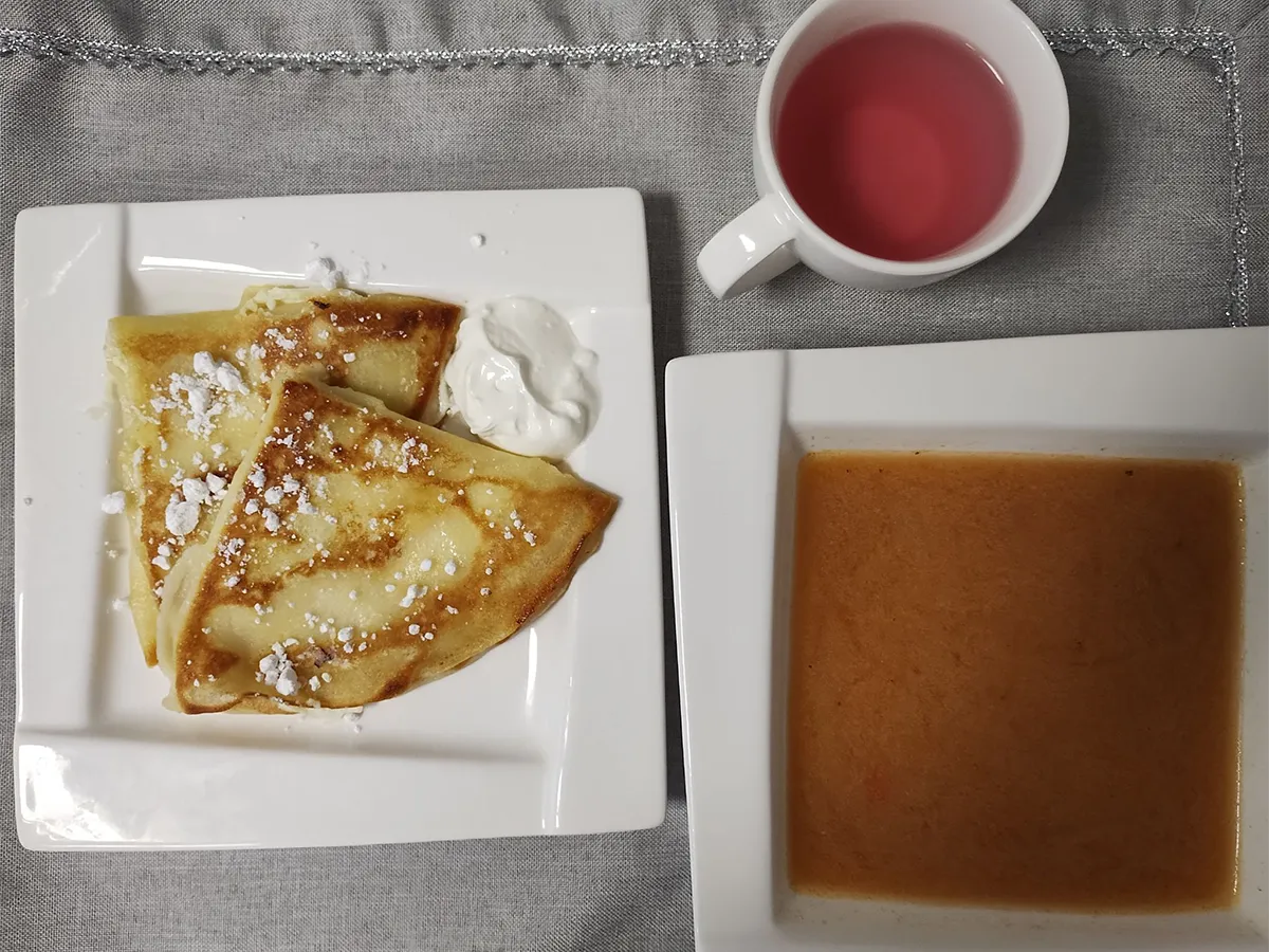 smażone naleśniki z serem twarogowym, śmietaną i cukrem pudrem |